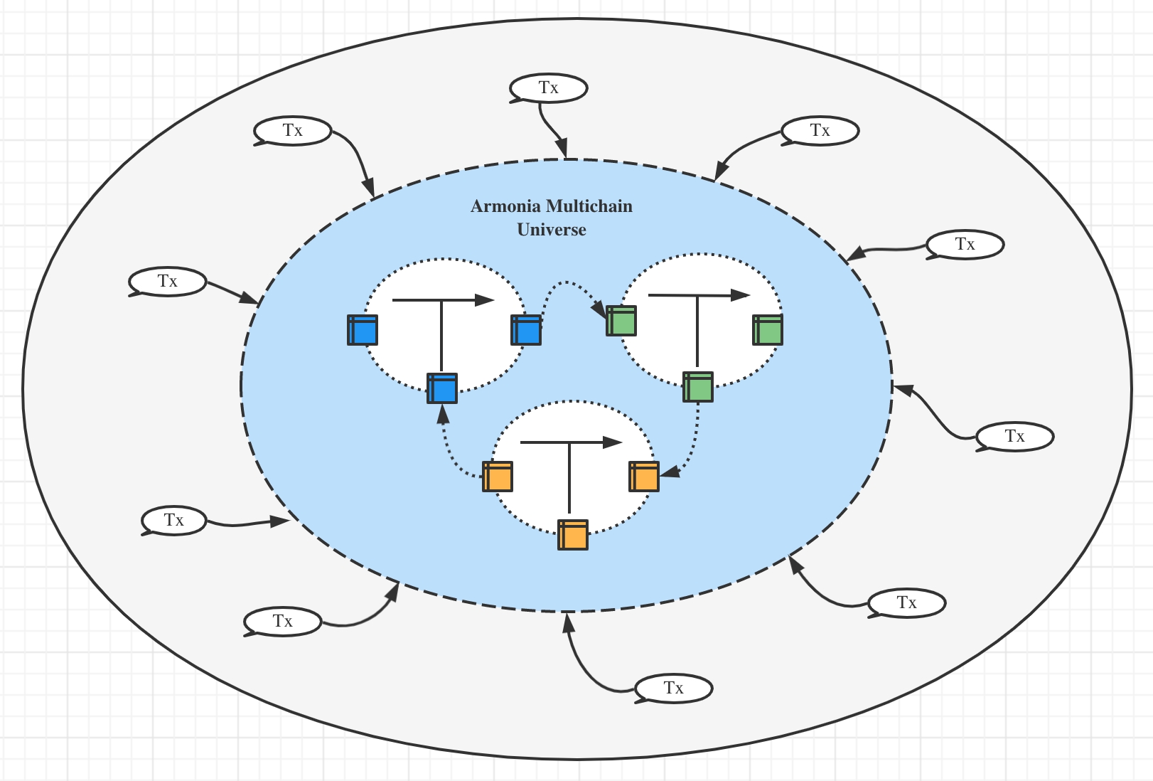 如下图所示,在Armonia多链体系下面将出现以下的多链分层架构: